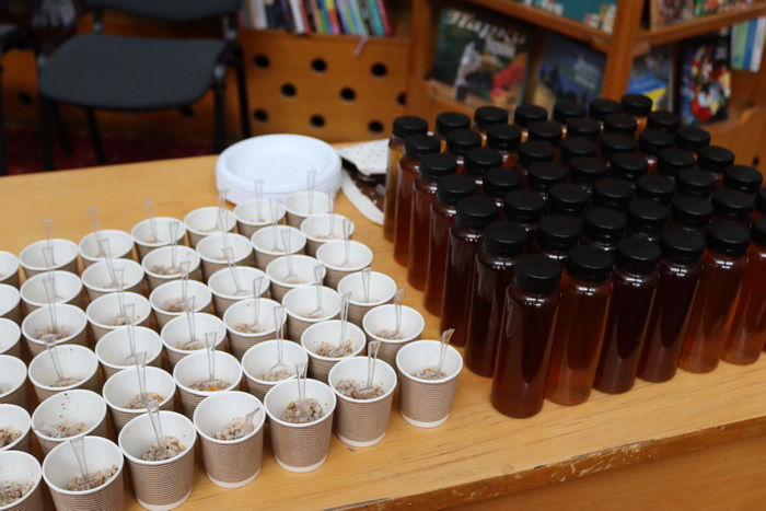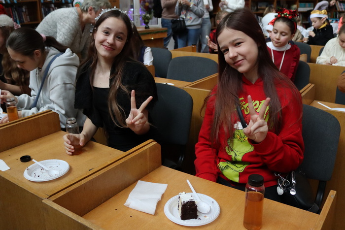 В Україні на Різдво родини готують святковий стіл з 12 пісних страв – кожна з них символізує здоров’я, добробут, любов та єдність родини: кутю, вареники, узвар та багато інших смаколиків, які дарують тепло й затишок. Тож у бібліотеці теж пригощалися – але дещо по-особливому. Дітям урочисто презентували величезний різдвяний торт, який символізує спільну радість та дитячі усмішки, бо для нас, дорослих, надзвичайно важливо бачити дітлахів щасливими. Тож юні читачі змогли сповна відчути солодку магію Різдва разом із бібліотекою. До всього кожен скуштував ще й куті з узваром.