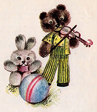 Купив тато Андрійкові ведмедика-скрипаля. Кумедний такий, у смугастих штанях, в одній лапі скрипка, в другій – смичок. На спині у ведмедика-дірочка. Вставиш туди ключик, заведеш – ведмедик на скрипці грає ще й пританцьовує.